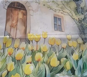 Śliczne żółte tulipany na tle budynku z oknem, starymi brązowymi drzwiami oraz zarysem drzewa.